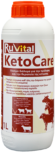 Το Ruvital KetoCare αναπληρώνει το έλλειμμα ενέργειας στην έναρξη της γαλακτοπαραγωγής και δρα υποστηρικτικά στην ανάκτηση της, περιορίζοντας τα επίπεδα κετονικών σωμάτων στο αίμα.