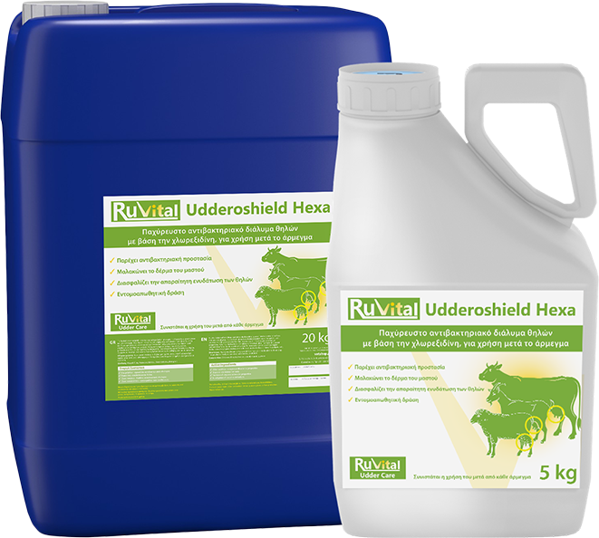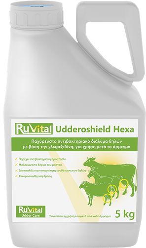 Εξαιτίας της παχύρευστης υφής του, το Udderoshield Hexa δε στάζει και δημιουργεί ένα ορατό πράσινο προστατευτικό φιλμ, μειώνοντας τον βακτηριακό πληθυσμό της θηλής των μαστών.