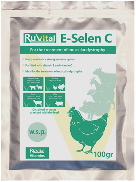 Ruvital E-Selen C 100gr is a water-soluble nutritional supplement, designed to strengthen the animals’ organism and increase their productivity.