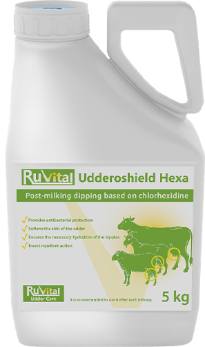 Ruvital Udderoshield Hexa contains chlorhexidine, glycerin, eucalyptus essential oils and tea tree oils.